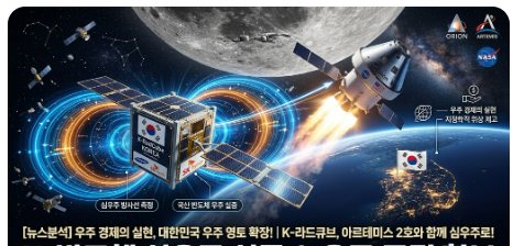 K-라드큐브의 아르테미스 2호 탑재는 대한민국이 '우주 고객'에서 '우주 공급자'로 변모했음을 알리는 신호탄이다. 심우주 방사선 측정과 국산 반도체 검증이라는 두 마리 토끼를 잡으려는 이번 시도는 기술적 자립도를 높이는 동시에 글로벌 뉴스페이스 시장에서의 경쟁력을 확보하는 결정적 계기가 될 것이다. 우주는 더 이상 머나먼 동경의 대상이 아니라, 우리 반도체가 숨 쉬고 우리 위성이 데이터를 수집하는 실질적인 경제 영토가 되었음을 시사하고 있다.