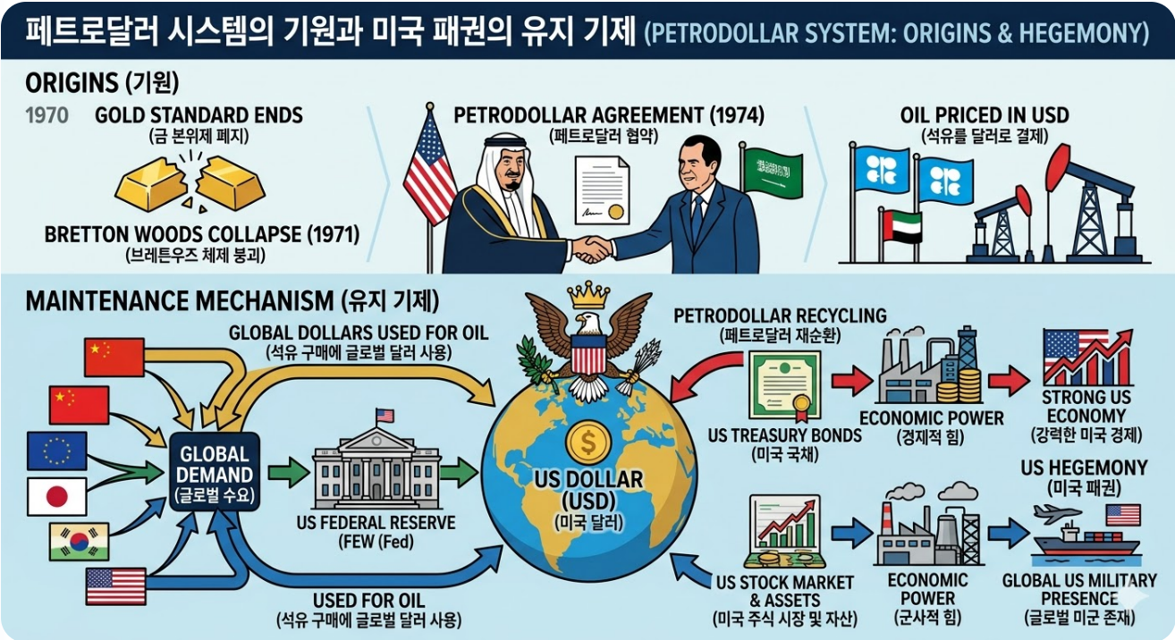 페트로달러 시스템을 이해하기 위해서는 1970년대로 거슬러 올라가야 한다. 1971년 닉슨 대통령이 금 태환 정지를 선언한 이후, 달러는 가치를 보증할 수단이 사라진 종이 조각이 될 위기에 처했었다. 하지만 1974년 미국은 사우디아라비아와 비밀 협약을 맺으며 반전을 꾀했다. 사우디가 원유 수출 대금을 오직 미국 달러로만 받고, 그 대가로 미국은 사우디에 군사적 보호와 무기 수출을 보장한다는 내용이었다. 이를 통해 전 세계 모든 국가는 기름을 사기 위해 반드시 달러를 보유해야만 하는 구조가 만들어진 셈이다.