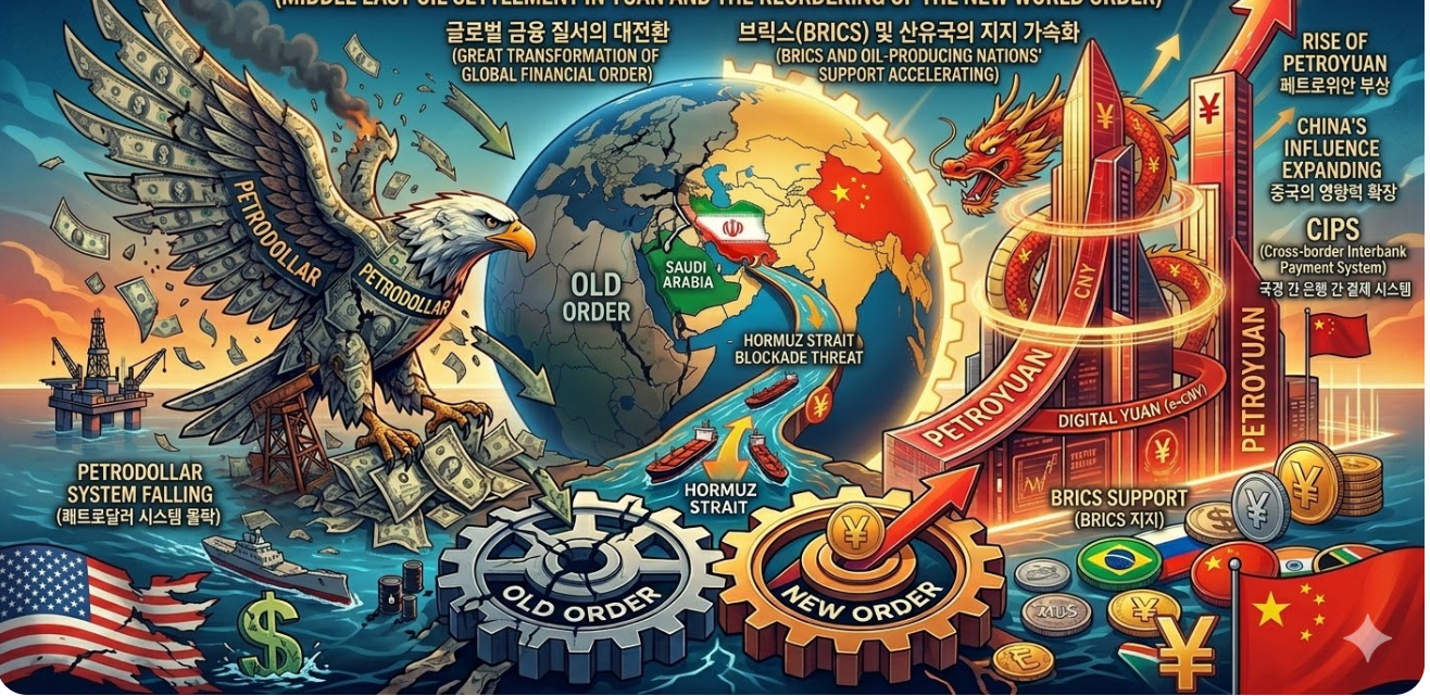2026년 현재, 중동을 둘러싼 지정학적 리스크는 단순히 한 지역의 분쟁을 넘어 전 세계 경제 시스템의 근간을 뒤흔드는 수준에 이르렀다고 본다. 특히 최근 미국과 이란 사이의 군사적 충돌이 계속되면서, 1970년대 이후 반세기 동안 세계 경제를 지배해온 '페트로달러(Petrodollar)' 시스템이 그 어느 때보다 강력한 도전에 직면해 있다는 사실은 부인하기 어렵다. 이란의 반격중 하나로 호르무즈 해협 봉쇄로 전 세계 에너지의 숨통이 막히자, 중국을 필두로 한 비서방 국가들이 달러 대신 위안화를 결제 수단으로 내세우며 새로운 판을 짜고 있는 상황이다. 이러한 변화가 단순한 일시적 현상인지, 아니면 거대한 시대적 전환점인지에 대해 깊이 있는 고민이 필요한 시점이라 생각한다.