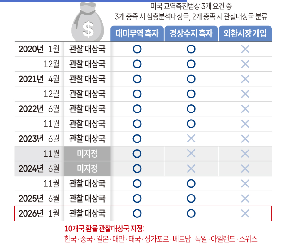 첫째는 150억 달러 이상의 대미 무역 흑자이며, 둘째는 국내총생산(GDP) 대비 3% 이상의 경상수지 흑자이다. 마지막은 12개월 중 8개월 이상 GDP의 2%를 초과하는 달러 순매수 개입이다. 한국은 이번에 대미 무역 흑자(500억 달러 상회)와 경상수지 흑자(GDP 대비 3.7%) 요건을 충족하여 명단에 포함되었다. 특히 경상수지 흑자가 기준치를 웃돈 것이 결정적이었다.