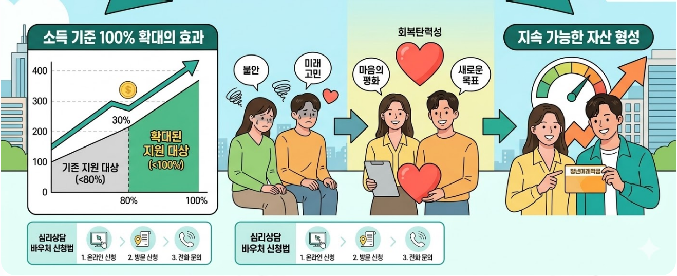 2026년 6월 출시 예정인 '청년미래적금'과 연계된 청년 마음건강 지원 정책의 핵심 내용을 점검한다. 기준중위소득 100% 확대에 따른 심리상담 바우처 신청 방법과 실질적인 혜택을 상세히 소개한다.