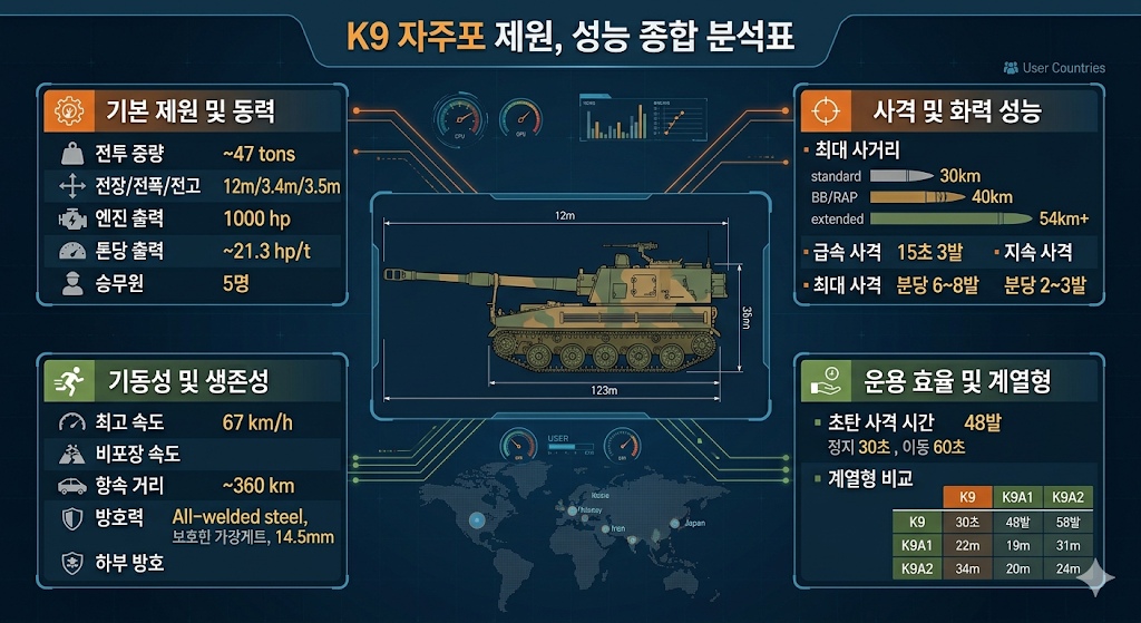 K9 자주포의 성능을 결정짓는 가장 핵심적인 수치는 사거리와 발사 속도다. 155mm 52구경장 주포를 탑재한 K9은 일반탄 사격 시 약 30km, K307 항력감소탄 사용 시 40km의 사거리를 확보하고 있다. 특히 최근 전력화되고 있는 사거리 연장탄을 적용하면 최대 54~60km 밖의 표적까지 정밀 타격이 가능하다. 기동성 측면에서도 1,000마력의 강력한 디젤 엔진과 유기압 현수장치를 장착하여 시속 67km의 속도로 거친 산악 지형을 주파할 수 있다. 승무원 5명이 운용하는 기존 모델은 급속 발사 시 15초 이내에 3발을 쏟아붓는 능력을 갖추고 있다.