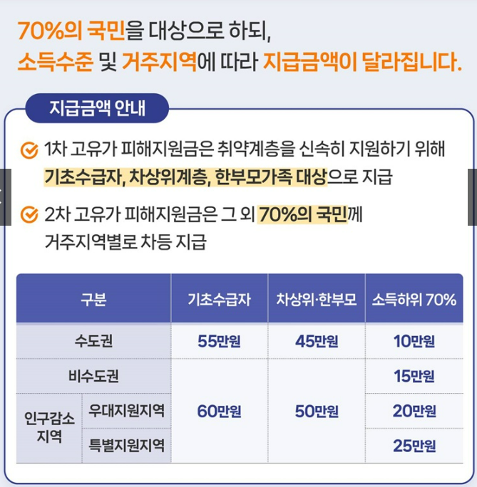 | 소득하위 70% | 10만 원 | 15만 원 | 20만 원 | 25만 원 |