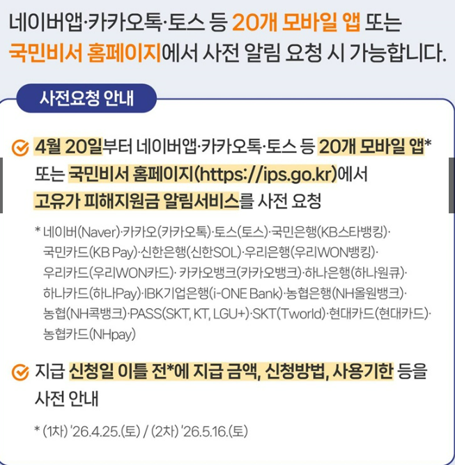 - 네이버, 카카오톡 등 모바일 앱의 국민비서 알림을 통해 지급 금액과 신청법을 사전 안내받을 수 있다.