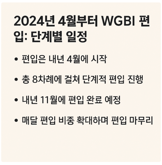 FTSE Russell은 2025년 3월 채권국가분류 리뷰에서 한국의 WGBI 편입을 2026년 4월 시작, 2026년 11월 완전 편입으로 공식 확정했다.